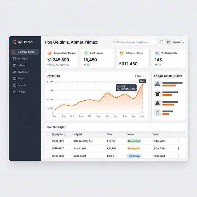 Karmaşık ERP sistemleri veya onlarca farklı ekran yok. Size özel sunulan OrtakB2B Panel i ile siparişlerinizi, kârınızı ve stoklarınızı tek ve modern bir arayüzden yönetirsiniz.